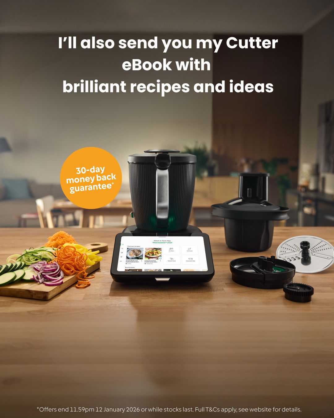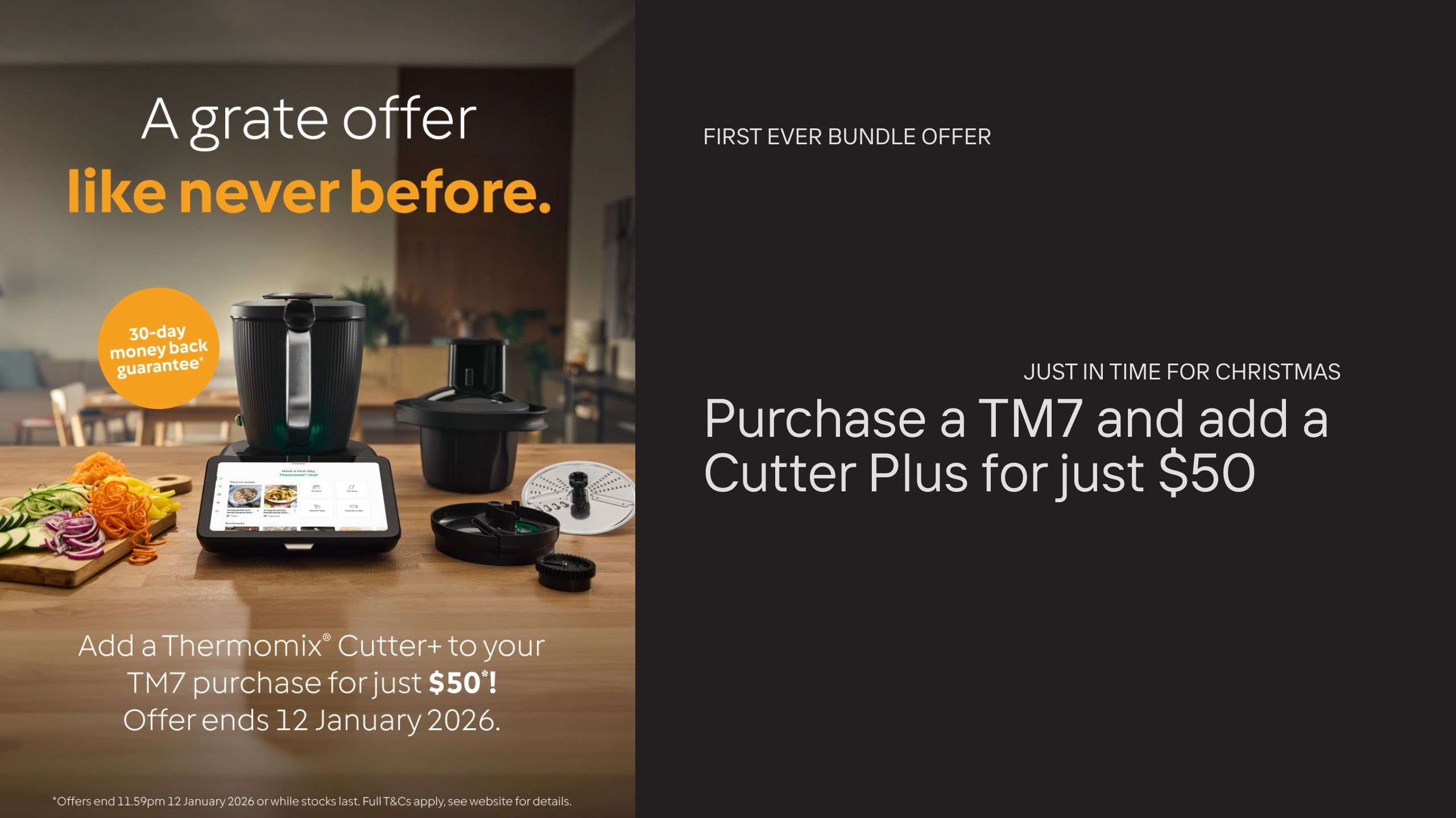 30-day Money Back Guarantee offer applies to Thermomix® TM7 purchases, including the Cutter+ bundle, between 9 am AWST 09 December 2025 to 11.59 pm AWST 12 January 2026.
